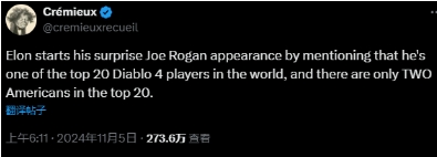 埃隆·马斯克跻身《暗黑破坏神4》深坑TOP20,成为美国玩家代表之一。