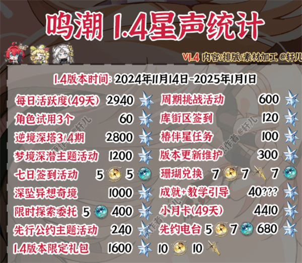 以上就是鸣潮1.4版本可获得抽卡资源统计的全部内容,希望对你有帮助。想查找更多游戏攻略,欢迎持续关注本站查看。