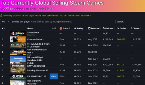 如下图所示,抛开Steam Deck和免费游戏《CS2》外,《潜行者2》已经成为Steam上当前收入最高的游戏,超过了《使命召唤21:黑色行动6》。