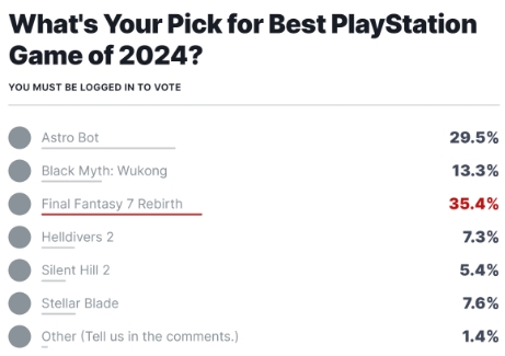 提名的游戏还包括《黑神话:悟空》、《最终幻想7:重生》、《绝地潜者2》、《寂静岭2:重制版》、《剑星》。其中,《最终幻想7:重生》以35.4%的得票率获得玩家排行榜首。