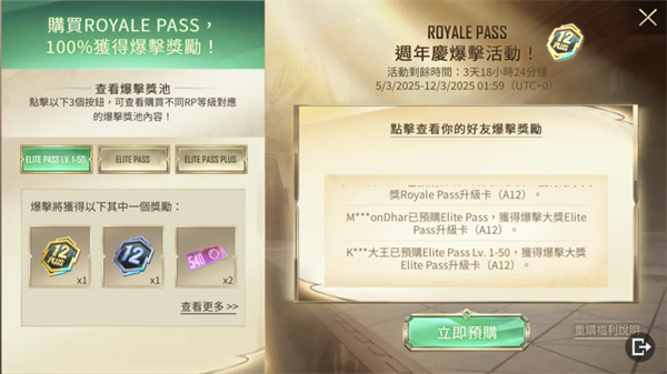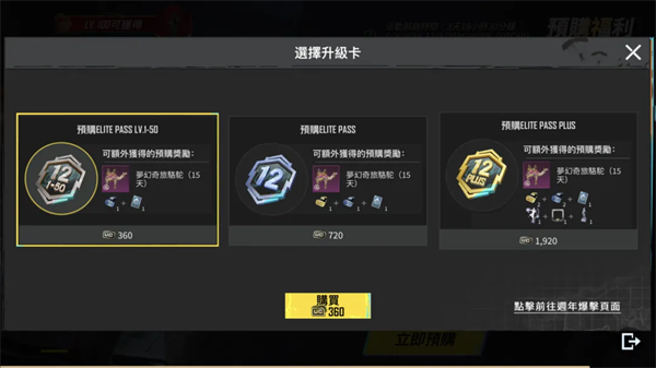 活动期间,特种兵可选择Elite Pass Lv.1-50、Elite Pass或Elite Pass Plus升级卡进行预购,版本更新后即可领取梦幻奇幻骆驼15天体验卡等福利!
