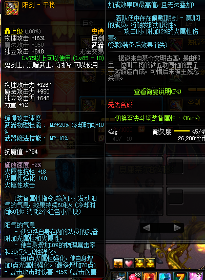 不错的武器,阳剑,这个武器用的时候一定要开装备指令,开了强,不开渣,只能走火强,不过好在火强便宜,适合肝帝,稍作打造,乌龟C是没问题的,当然了上山那是另一回事了。