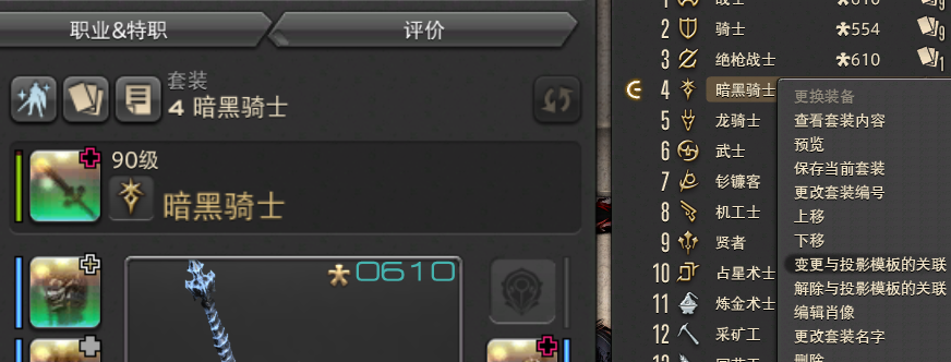 游戏中的各个职业其实都可以绑定对应的幻化外观,在人物的属性界面点“套装列表”,右键职业图标,会有“与投影模板关联”。选择喜欢的外观两者关联,之后再切职业就可以直接幻化外观啦。