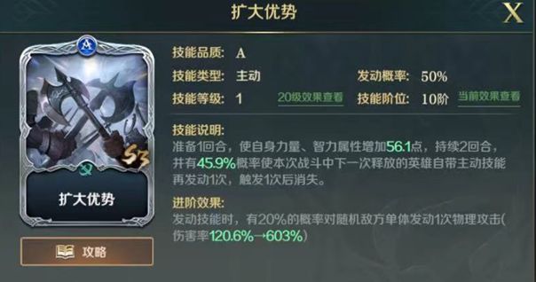主动技能提升自身属性,让英雄自身的主动技能在下回合中第二次释放。 【扩大优势】增强玛丽亚特蕾莎自身属性,增加伤害输出;另外,【扩大优势】的第二阶段效果可以让玛丽亚特蕾莎的【三裙联盟】反复释放。