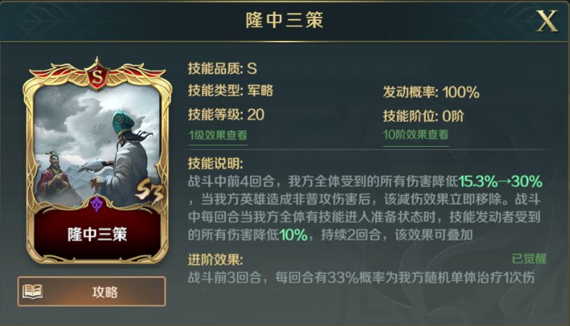 可以减少我方受到的伤害。受到非普通攻击伤害时,移除伤害减免效果;每当我方拥有技能并进入准备状态时,技能发起者可以获得伤害减免。 【隆中三策】可以全面保护我方所有英雄,配合【扩大优势】、【夜战桑干】、【三裙联盟】、【伊比利亚联盟】的备战效果,可以增加队伍的续航。推动。