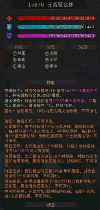 第二部是我们的老朋友莫神亚米,穿着巨神套装和毒环(低面板或者金刃刮),黎明英雄双C,黎明及时驱散莫神增益,用毒克血恢复效果。战斗结束后,返回元素之塔,取出元素核心。