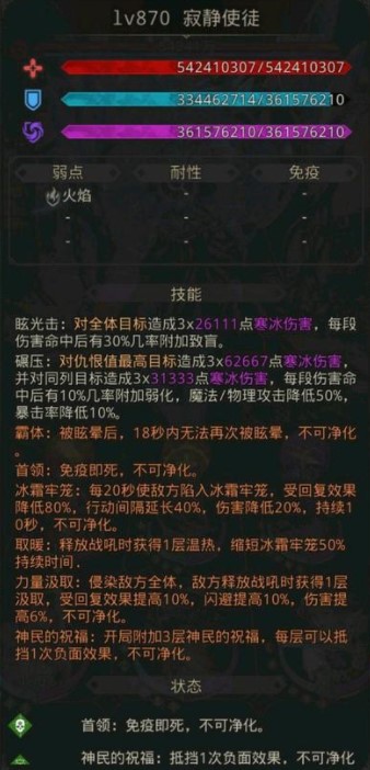 8、在候选人住处,先到神恩频道进行对话。如果得到线索,可以去候选人的住所削弱道具。进入候选人住处打架,这也太离谱了。推荐阵容,冰系魔法带致盲法杖,恶魔之魂先行,加速,永恒希望奶,加速,如果一开始的冰系魔法攻击无法致盲怪物,就退出,否则毫无意义,怪物的被动攻击会增加35暴击率和1倍爆炸伤害,并且不能直接致盲双C。战斗结束后与NPC对话,传递削弱道具,前往神恩窄道。