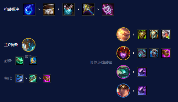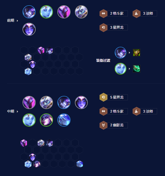 前期保留明星棋子,帮助你获得更好的经济。 1-3 转到4,2-5 转到5。将法国装备交给拉克斯,将坦多装备交给塞拉斯。如果能实现连胜,经济就会直接起飞。即便没有大连胜,因为每回合都有星体棋子补充力量和经济,也能很好地度过前中期。