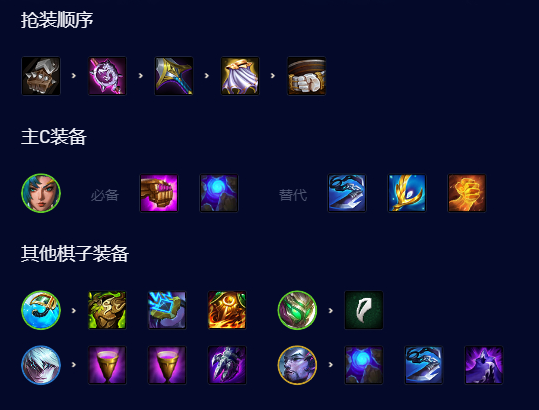 前期优先寻找卡莎激活的法力恢复装备,然后补充伤害装备。第三个项目通常推荐用于巨型杀戮。前排的肉类装备也很重要。扎克的阳火和离子都是核心装备。最后,应该考虑圣杯伏击等功能性装备。