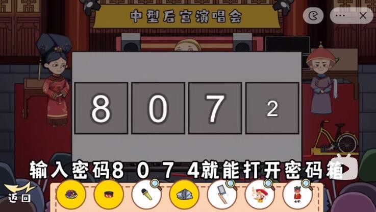 2.把太监的拉链拉下来,衣服变黑,就可以得到空袋子。把衣服穿在皇帝身上就可以得到密码8074。