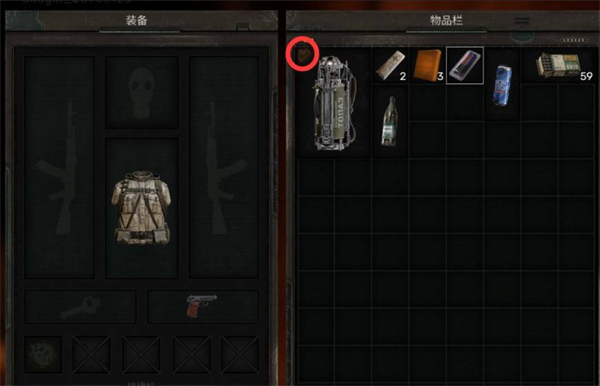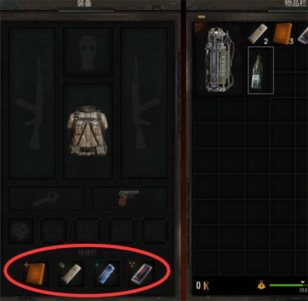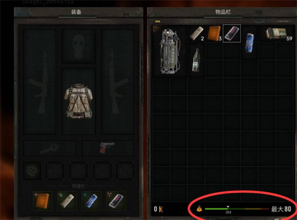 物品栏下方的负重提示非常重要,超过负重会影响行动,且会触发“超重”提示。