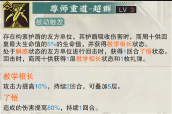 构术护盾吸收构素伤害时,可以获得教学相长状态,增加最多50%的攻击力。在回击体系中,这能为解惑状态下的器者提供额外伤害加成。三知情况下,回击器者还能回礼弹,这对于整体输出和续航有帮助。