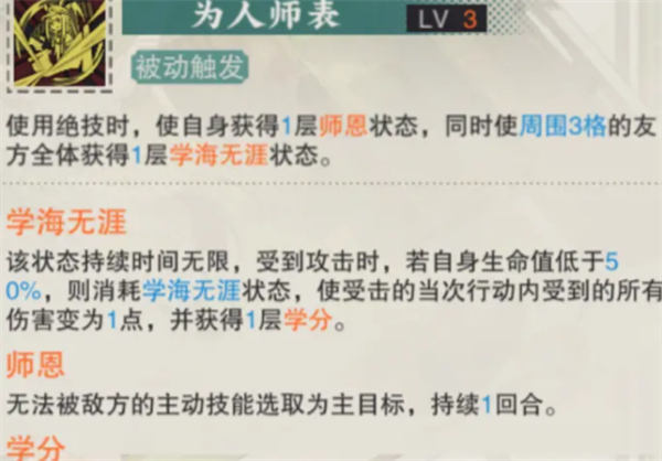 绝技使用后,3X3范围内的友军获得学海无涯buff,提供免伤效果。触发条件是友方器者血量降到50%以下,这在高难度副本中可能会***脆皮角色,导致效果难以触发。7%的吸血机制需要在免伤后才能生效,对某些角色来说可有可无。