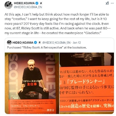 小岛秀夫还对“科幻电影教父”雷德利·斯科特献上敬意,他说:“即使是现在,87岁的雷德利·斯科特(Ridley Scott)仍很活跃。当他60多岁时——也就是我现在的人生阶段,他创作了杰作《角斗士》。”