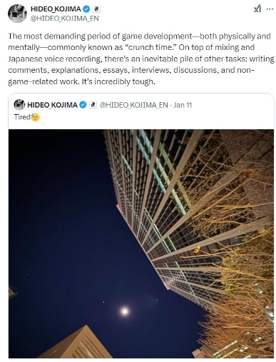 小岛秀夫说:“游戏开发过程中最耗费体力和精力的阶段,通常被称为“冲刺时间”(Crunch Time)。除了混音和日语配音录制之外,还有一堆事情要做,比如撰写评论、说明、文章、采访、讨论以及与游戏无关的工作。这真是一段艰难时期。”