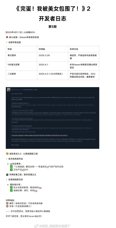 《完蛋!我被美女包围了2》于3月29日首次提交审核并通过,产生了版本信息。4月1日团队收到Valve的首次反馈,针对审核提出了一些修改意见。随后团队迅速响应,并在4月3日完成第二次提交审核。