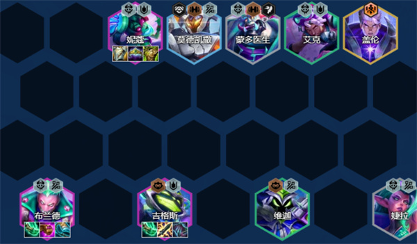 3、后期转九:八级后补出小法与盖伦,再视情况上莎弥拉或可酷伯。若顺利追出二星佛耶戈与高质量替换卡,可进一步提升阵容质量。