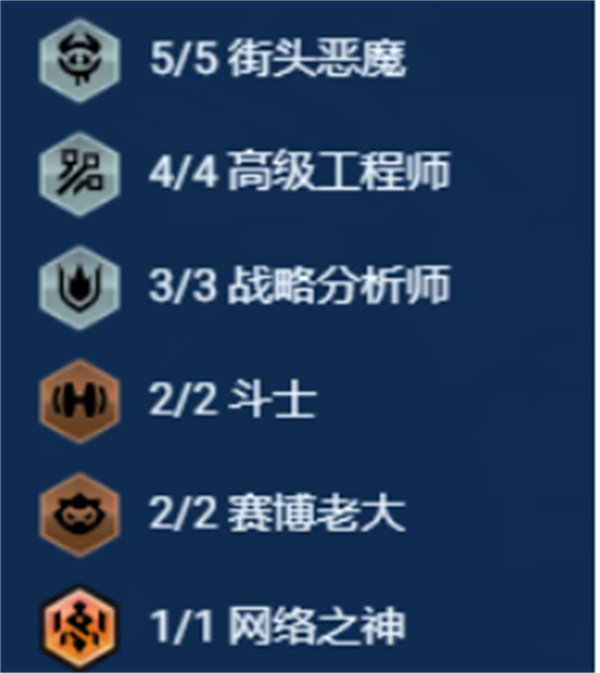 2、中期稳血:七人口小D找关键两星,如火男与妮蔻,凑齐5街头恶魔+工程师基础框架。
