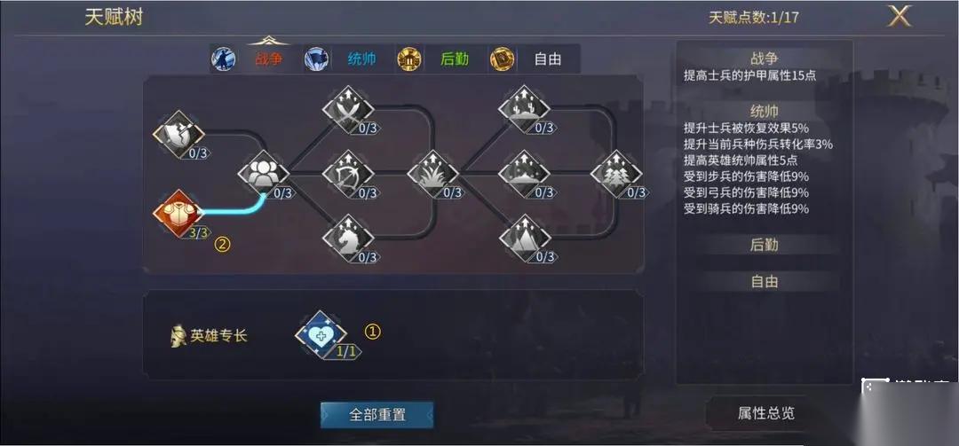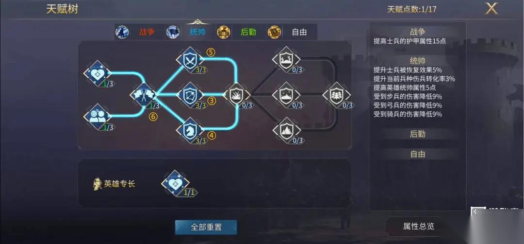 “英雄专长”大于“基础天赋”,百分比大于固定值;如图所示,下方的是英雄专长天赋,六星英雄2个,五星英雄1个,四星及以下英雄没有,上方的天赋树,成为“基础天赋”,分为【战争】、【统帅】、【后勤】、【自由】,自由天赋是一个单独的体系,我们后面专门出自由天赋的攻略。