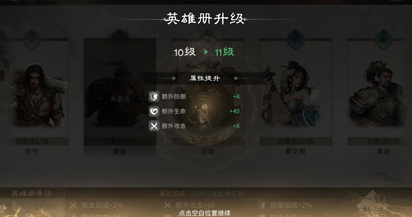 每获取新的英雄,或原有英雄升阶,都可以获得英雄册经验,提高其等级,等级越高,则获得的属性加成越多。