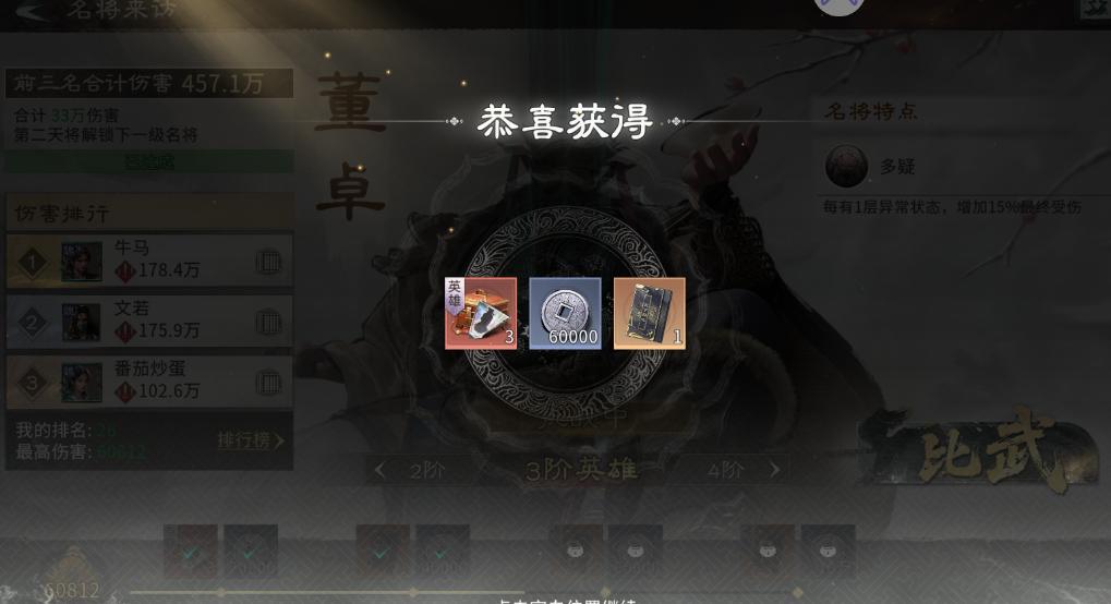 【名将挑战】:完成主线【第十二章】后解锁名将来访活动,参与活动将根据对名将的伤害获得奖励,参与可获得英雄碎片卡包和银币奖励。