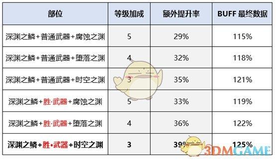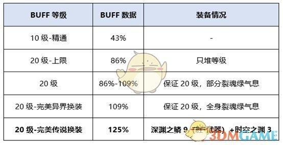 换装搭配新换装以深渊之鳞9件套(防具5+首饰3+武器1)为基础,之后视个人情况选择不同的特殊三件套进行搭配。新传说换装自带BUFF等级加成,相比异界与绿气息换装达成完美的难度降低。以完美换装为例,装备自带3级BUFF,计算时装、宠物、光环、称号4级后,再堆3级即可完美,相比完美异界换装需要的6级成本降低。下表为不同搭配的装备带来的等级、额外提升率。【深渊之鳞+胜·武器+时空之渊】为完美换装。