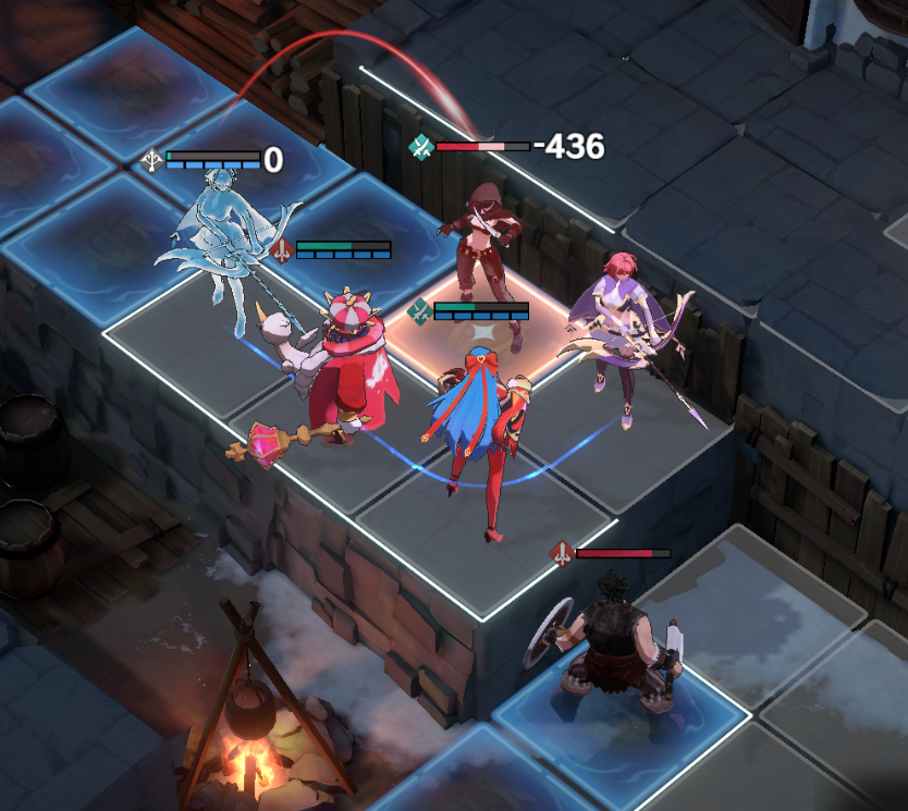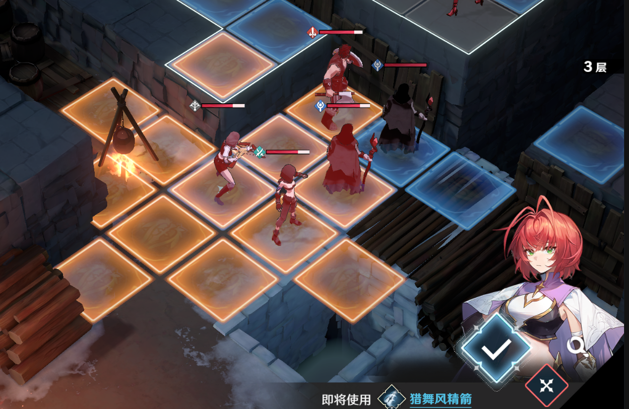与前两级相比,第三级的难度急剧增加。不仅敌人数量众多,而且想要将地怪一一解决掉,基本上是不可能的。另外,射程极远、移动范围大的弓箭手,一有机会就可以偷窃。拥有剩余生命值的盗贼让整个战斗变得非常麻烦。因此,玩家需要合理利用单位攻击范围对身高差的限制,以及希拉技能【八相之谜:无】的高输出,尽快解决。敌人对盗贼和弓箭手的威胁最大,降低敌人的DPT,防止任何角色被单回合多次普攻和单击击杀。