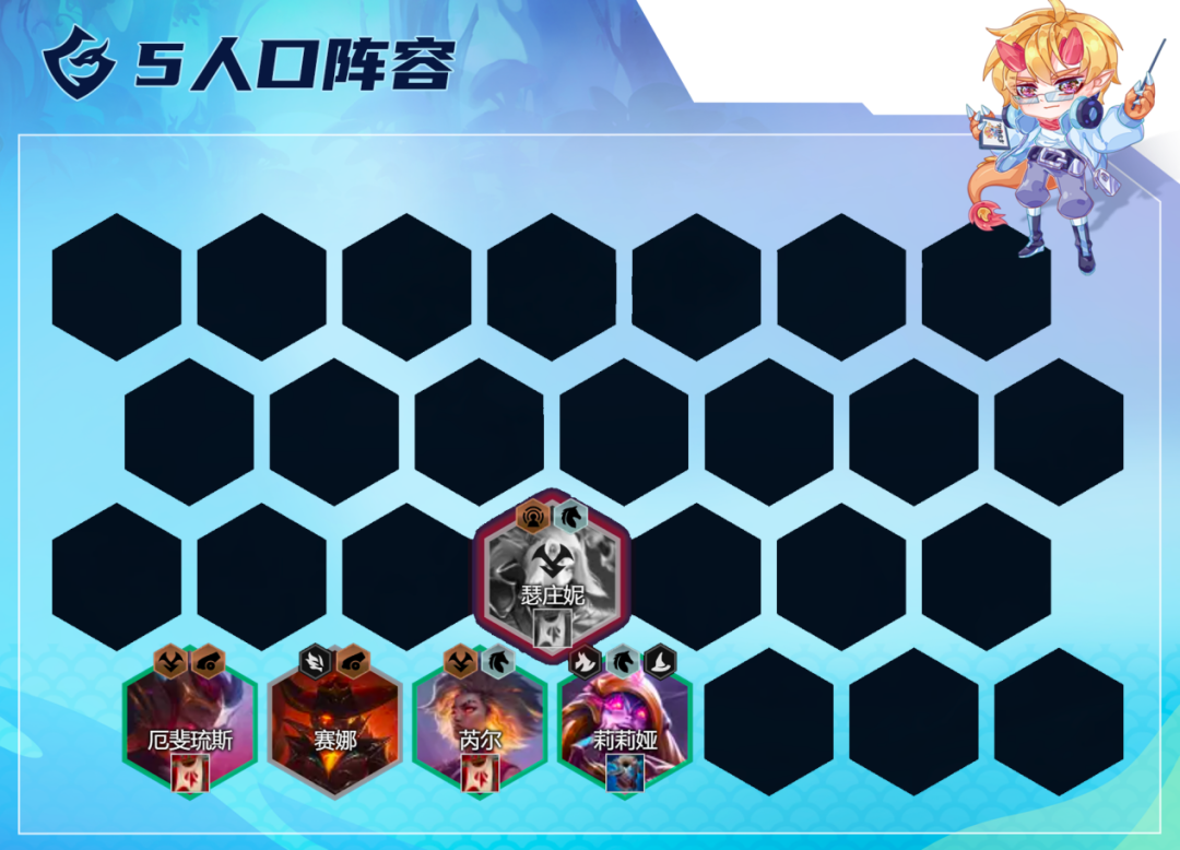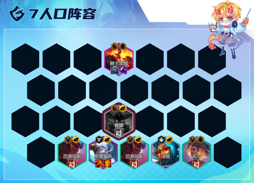 秘宝龙补充格雷夫斯的夜刃,4-5或5-1升级8人,添加诺姆希开6个枪手,只需搜索卡牌即可找到所有2星。如果有炮手的话可以换泽利去雷恩加尔。血量稳定后,将人口升级到9,并添加第二个格雷夫斯。