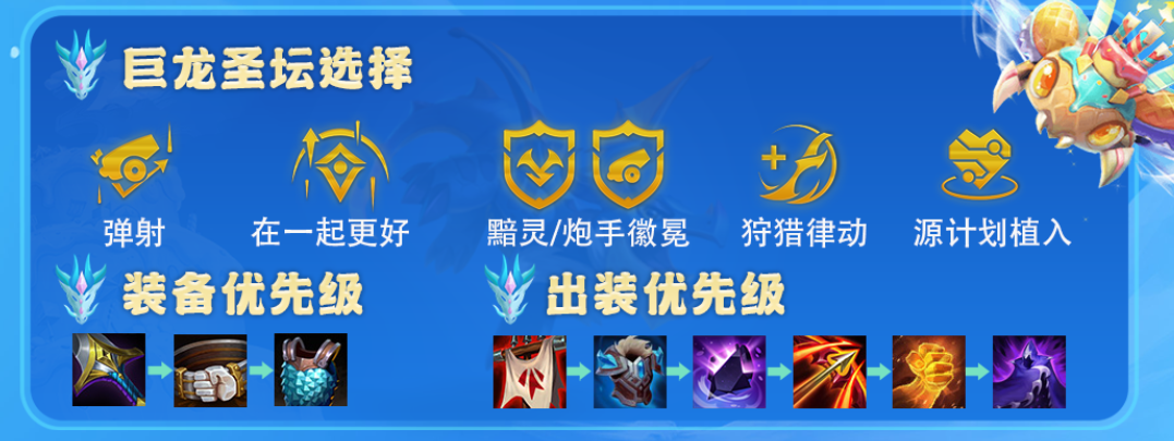 阵容必须有弹射,只有弹射才能打。其他人在一起会更好。暗灵/枪手的徽记/王冠、狩猎节奏、源计划植入都比较优质。