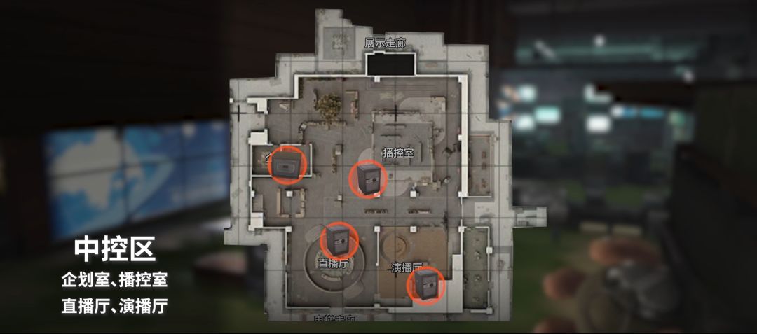 地图中央的中央控制区是电视台物资最丰富的区域,还有一些物资分散在各个地点。策划室、播控室、直播厅、演播室还设有保险箱。除了策划室的门需要钥匙才能打开外,其他三间都是免保险的。