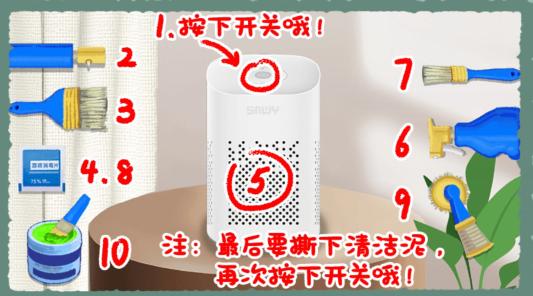 2.我们先点击上面的开关,它开始播放音乐并弹起很多灰尘,然后我们开始清洁