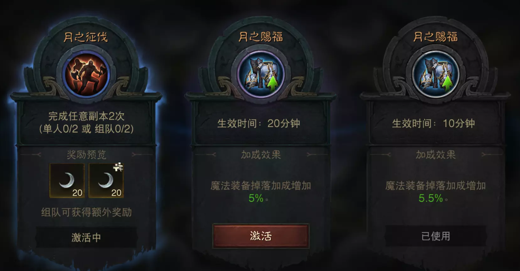 活动期间,杀死10 个怪物即可额外获得1 个月亮占有率。每天杀死最多20 个怪物将额外获得2 个月亮财产。每天第2次、第3次的月属性都会获得魔法装备掉落奖励。 buff,激活并总共使用完12个福利,即可打开满月礼物,获得120个新月微光。