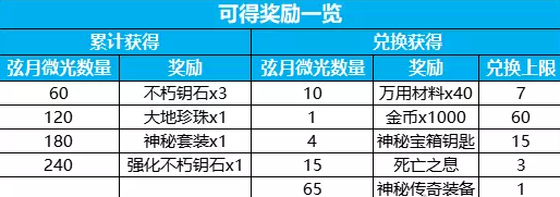 完成任务,收集一定数量的月牙熠熠,即可获得不朽钥石、地珠、套装、强化不朽钥石。