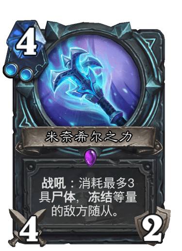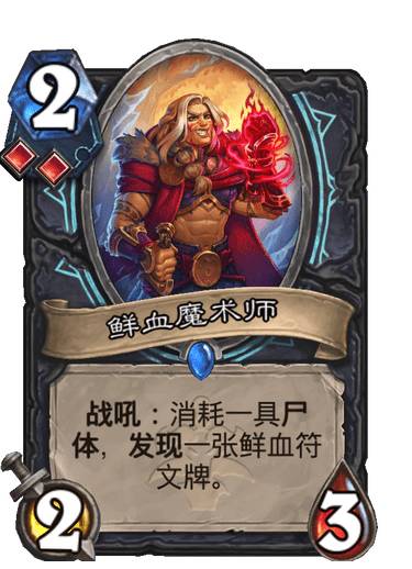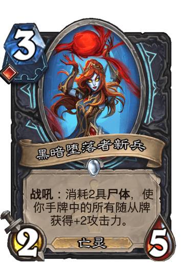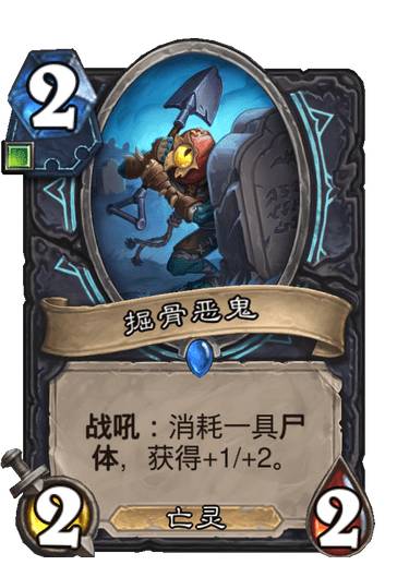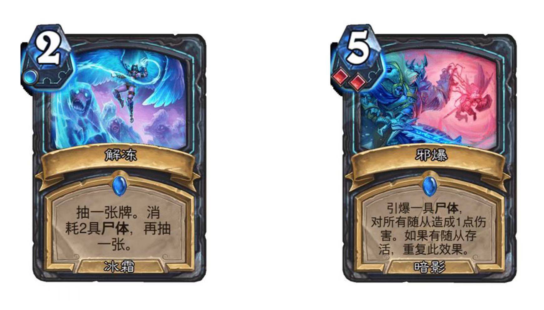 死亡骑士的部分卡牌会通过消耗尸体产生额外效果(如下图左图),也有一些卡牌必须消耗尸体(如下图右图)。后者是其他职业无法通过抄袭或者其他方式获得的。