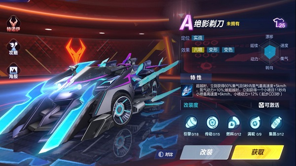 绝影剃刀实用能力很强,是一款赛车,适合与实力相近的对手较量时使用。尤其是在狭窄的道路或弯道较多的轨道上,经常会发生超车和被超车的情况,这进一步增加了该功能的触发次数。