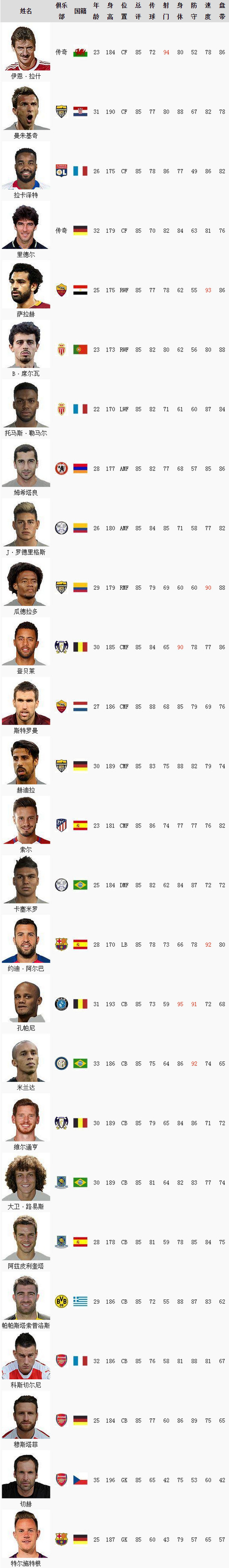 实况足球2019能力值大全
