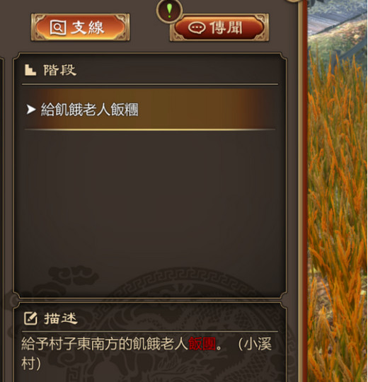任务条件:搜到破损的剑,然后跟大福对话就有了,老年人记忆,好像是在家里搜到的, 在主角房间右边那个师父的房间搜到的断剑。